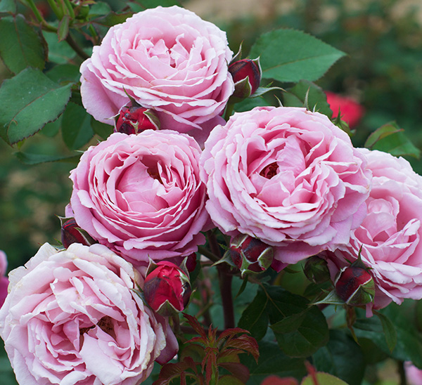 Classic, romantic rose with pastel to shell pink cup shaped flowers bursting with petals. Clusters of peony-like blooms with a strong lavender fragrance bloom through spring against hardy, deep green, disease resistant foliage.