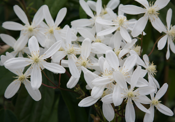 Description: The only evergreen clematis. Maintaining a year round appeal of green. Exposure: Full or part shade. Bloom: Large sprays of tiny star shaped white blossoms are fragrant and bloom in early spring. Pruning: Only to shape or clean up. Click HERE to return to our Clematis page. |