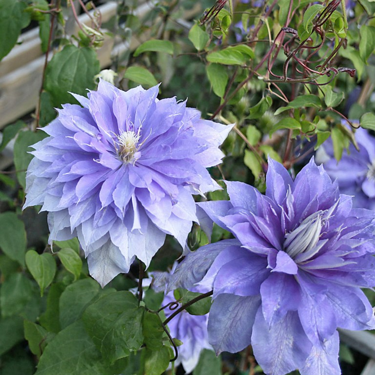 Ruffly, playful, maximalist flowers are extraordinarily double, with piles of lavender-violet petals cascading from the ivory center like a fountain. Large (up to 5-7" across), handsome, heavy flower heads bloom magnificently in their first flush, with an additional bloom in late summer that produces single flowers - the best of both worlds! Vigorous, deep green foliage can thrive in containers, in shady landscapes, climbing over fences and up arbors - anywhere it has something to climb and a shady spot to put its roots! Pruning: In late January/early February, cut to 6-8” from ground level to a pair of buds. Then cut by half after the first flush of blooms is finished. Feed after each pruning session with well-balanced fertilizer.