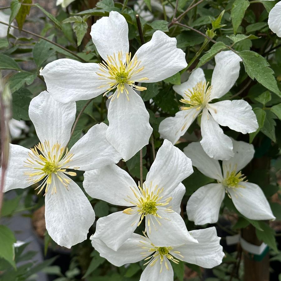 A member of the Montana group (otherwise known as an Anemone Clematis), this hardy, quick-growing, vigorous climber is a winner of the Award of Garden Merit from the Royal Horticultural Society. Hundreds of petite, snow white, four petaled flowers, each only reaching around 3" across, bloom so prolifically that they can fully cover the deep green foliage, releasing a gentle, sweet fragrance from their golden anthers. Despite the diminutive size of the flowers, this powerhouse can grow absolutely massive if left to its own devices. No need for regular pruning to keep the blooms coming; just clean up once the flowers are done. Pruning: In late January/early February, cut to 6-8” from ground level to a pair of buds. Then cut by half after the first flush of blooms is finished. Feed after each pruning session with well-balanced fertilizer.