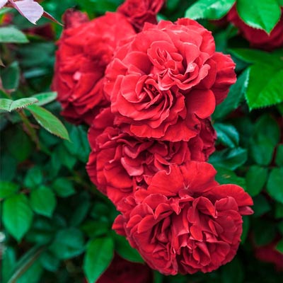 With its neat, compact growth habit and abundant clusters of deep red, old-fashioned blooms set against the deep green glossy foliage, this beauty is sure to become one of your all time favorite climbing roses ever! Slightly ruffled at the edges, these fragrant flowers are large—up to 4" across and are produced profusely all summer long. Grow on a fence, arbor or tall obelisk, sit back and enjoy the show!