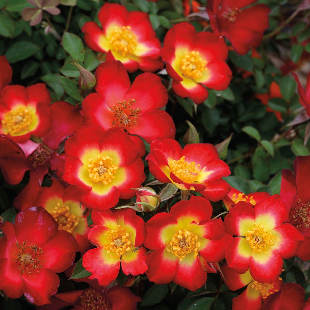 The sweetest little low growing rose! A new introduction for 2025, hundreds of adorable little five petaled blooms cover the deep green foliage from summer through fall, with no fragrance to distract from their mesmerizing color. Golden anthers are surrounded by buttery gold petals edged with a bright cherry red for a playful pop of color all season long! Bushy, disease resistant foliage grows only 1-2 ft high by 3-4 ft wide, making it an excellent choice for groundcover, low hedging, or even a wide container.