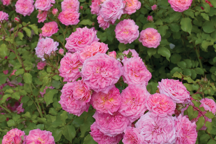 Full, luxurious blooms are for low growing roses too! Hundreds of clusters of pure pink flowers bloom from late spring through fall, with sweet little 3 inch flowers packed with 30-35 ruffly petals. Deep green foliage grows bushy and dense in a compact form, only reaching 1 1/2 ft high by 2 1/2 ft wide. Big color delivered in a small package! A perfect size for containers, groundcover, or low hedging, and a must have in a cottage style rose garden.